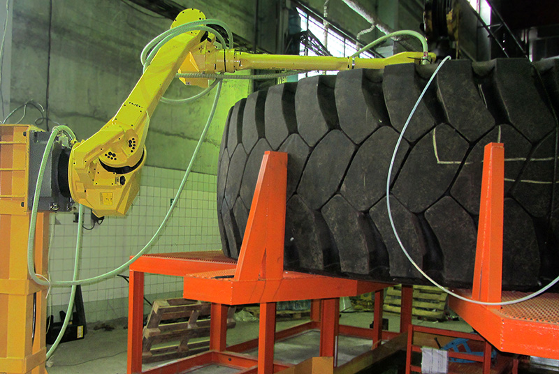 Промышленный робот в составе робототехнического комплекса обеспечивает гидроабразивную резку шин в полностью автоматическом режиме.