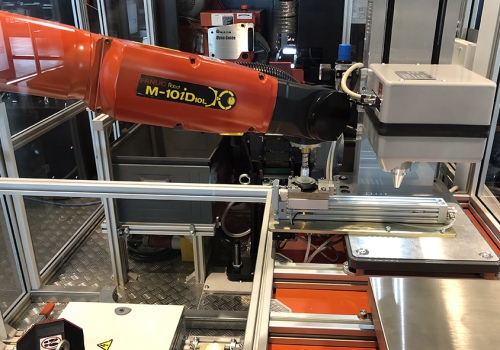 Промышленный робот в составе робототехнического комплекса обеспечивает выгрузку нарезного станка, с последующим контрольным взвешиванием и маркировкой изделий.