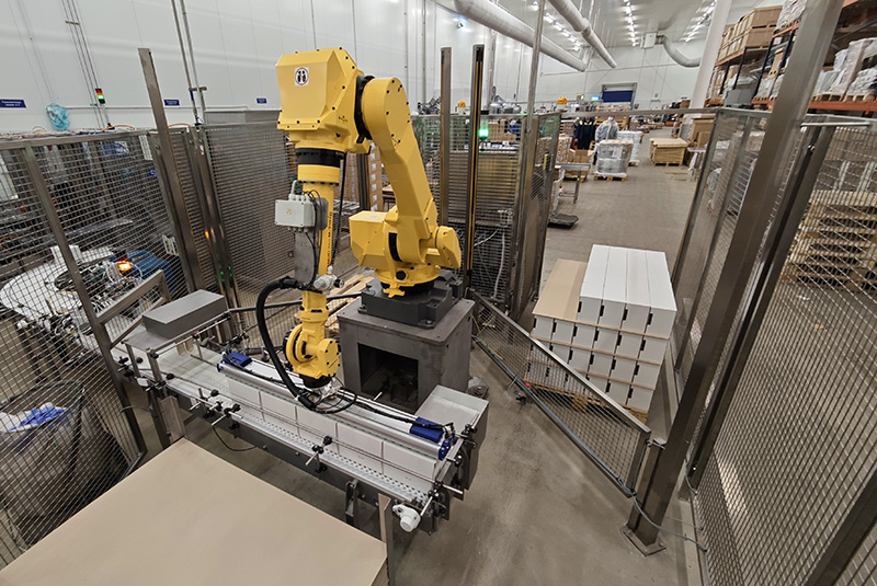 Промышленный робот в составе робототехнического комплекса обеспечивают автоматическую выгрузку и укладку коробок с пищевой продукцией.