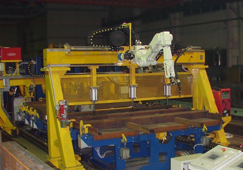 Промышленный робот в составе автоматической линии обеспечивает сварку торцевых стенок полувагонов.